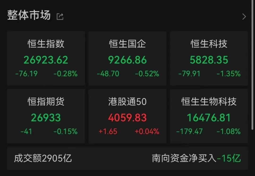 截至收盤,恒生科技指數(shù)跌1.35%,盤中一度大跌至2%;恒生指數(shù)、恒生國(guó)企指數(shù)分別下跌0.28%、0.52%。港股市場(chǎng)今日成交額為2905億港元,南向資金凈流出額為15億港元。