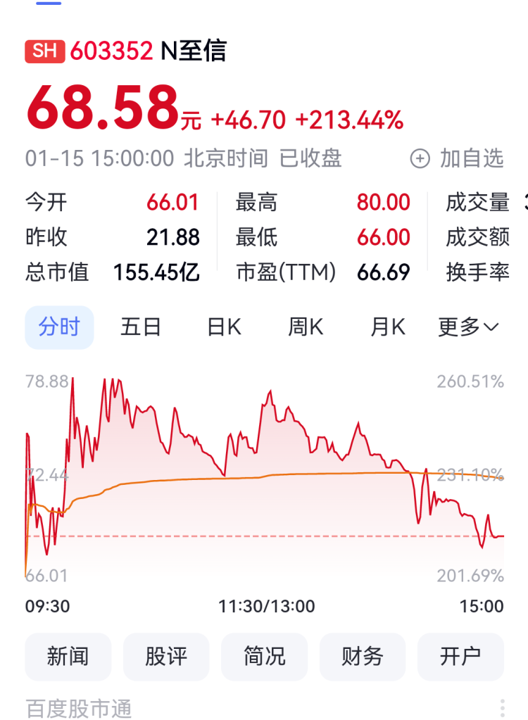 至信股份開盤價(jià)66.01元,盤中最高觸及80.00元,最低66.00元,下午3點(diǎn),最終報(bào)收68.58元/股,較發(fā)行價(jià)21.88元,上漲213.44%,至信股份總市值達(dá)到155.45億元。