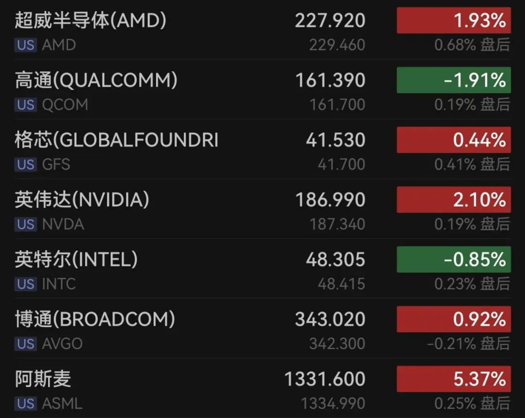 芯片股多數(shù)上漲,費(fèi)城半導(dǎo)體指數(shù)漲1.76%,刷新歷史新高??铺彀雽?dǎo)體漲超7%,應(yīng)用材料漲逾5%,阿斯麥漲超5%,臺(tái)積電漲逾4%,超微半導(dǎo)體漲近2%。跌幅方面,德州儀器跌超2%,高通跌逾1%,邁威爾科技跌超1%。
