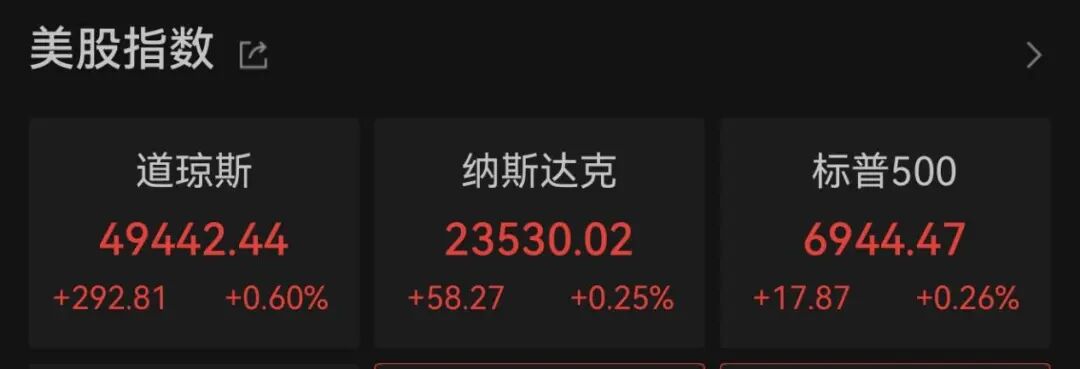道指漲292.81點(diǎn),漲幅為0.60%,報(bào)49442.44點(diǎn);納指漲58.27點(diǎn),漲幅為0.25%,報(bào)23530.02點(diǎn);標(biāo)普500指數(shù)漲17.87點(diǎn),漲幅為0.26%,報(bào)6944.47點(diǎn)。