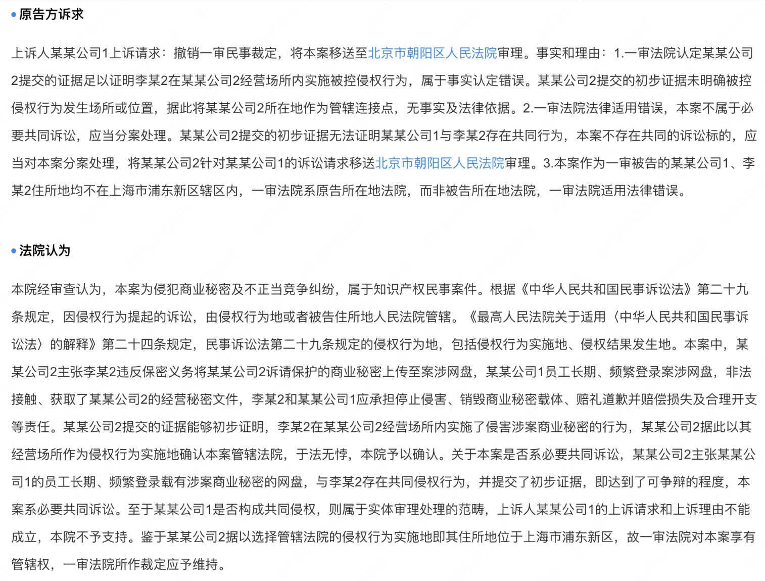 對此,法院認(rèn)為特斯拉提交的證據(jù)可以初步證明李程在宏利基金經(jīng)營場所內(nèi)實施了侵害涉案商業(yè)秘密的行為,并且據(jù)此確認(rèn)管轄法院并無不妥;同時確認(rèn)其屬于必要共同訴訟。因此駁回宏利基金關(guān)于撤銷一審民事裁定,將本案移送至北京市朝陽區(qū)人民法院審理的請求。
