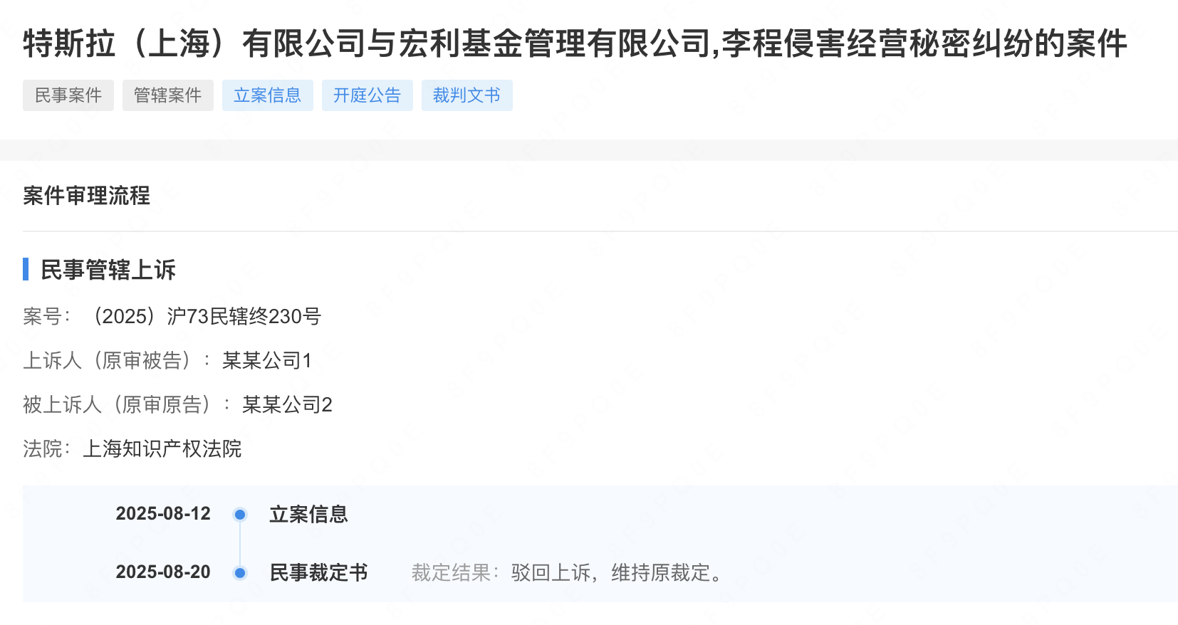 早在2025年8月,這兩家公司之間就發(fā)生過一起民事管轄上訴,雖然沒有披露上訴人、被上訴人以及當(dāng)事人的信息,但通過猜測可知,民事裁定書中的某某公司1指的是宏利基金,某某公司2則指的是特斯拉,而李某2指的則是李程。