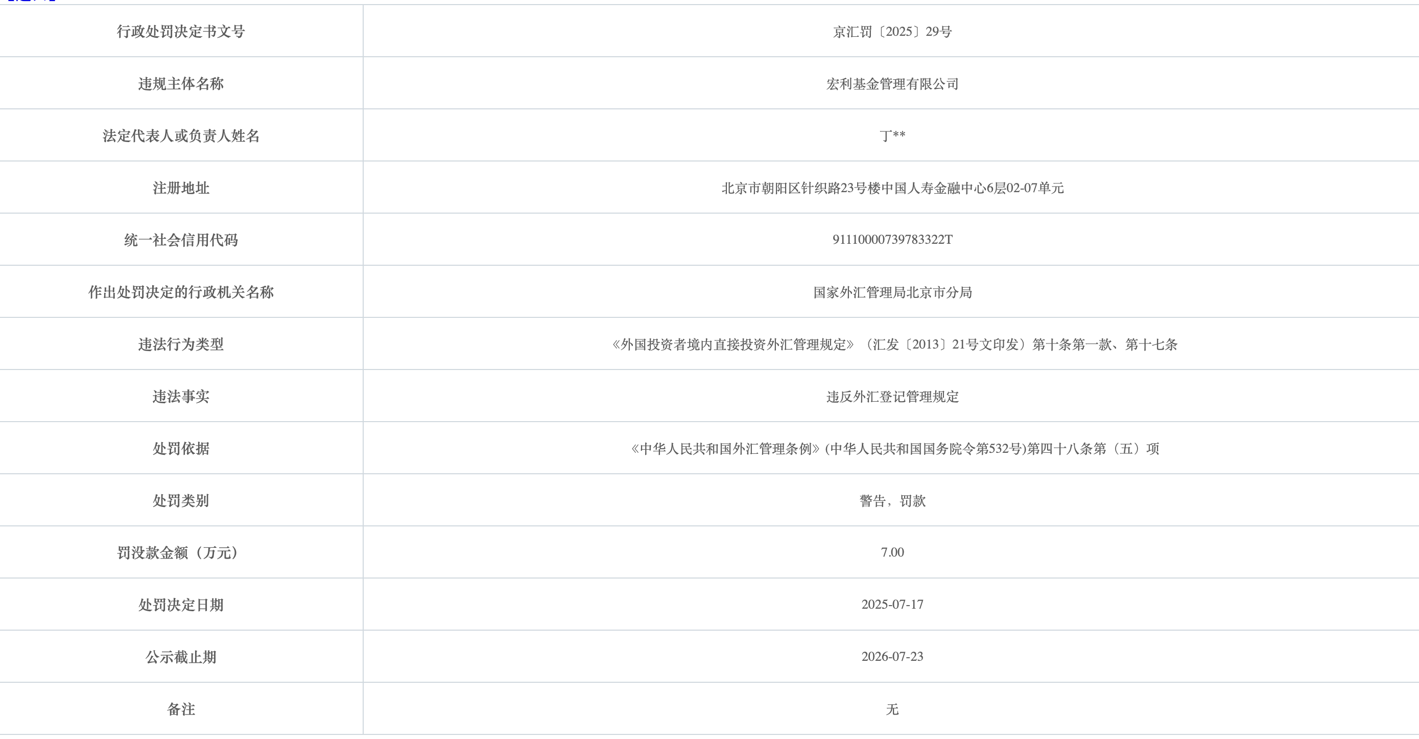 近年來,宏利基金曾多次因為內(nèi)部合規(guī)問題受到處罰。2022年年報披露,2022年8月,由于內(nèi)控管理不完善,公司及時任總經(jīng)理傅國慶分別被北京證監(jiān)局采取責(zé)令改正和警示的措施;2022年10月,由于高管代履職超限,宏利基金再次被北京證監(jiān)局責(zé)令改正。2025年7月,國家外匯管理局北京分局公布的行政處罰信息顯示,宏利基金因為違反外匯登記管理被警告并罰款7萬元。