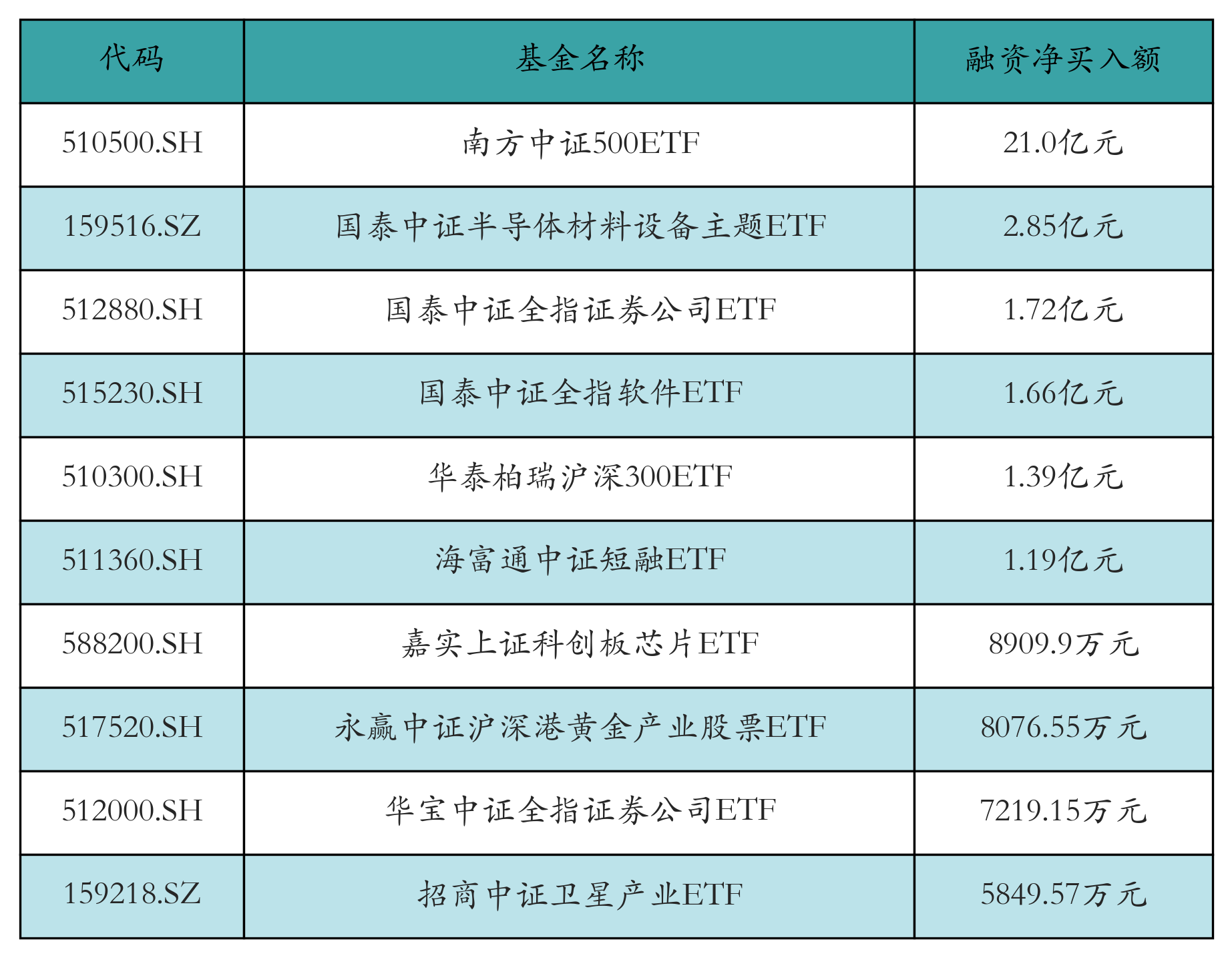 1月15日ETF融資凈買入額前三位分別為:南方中證500ETF(21.0億元)、國泰中證半導(dǎo)體材料設(shè)備主題ETF(2.85億元)和國泰中證全指證券公司ETF(1.72億元),前10具體見下表: