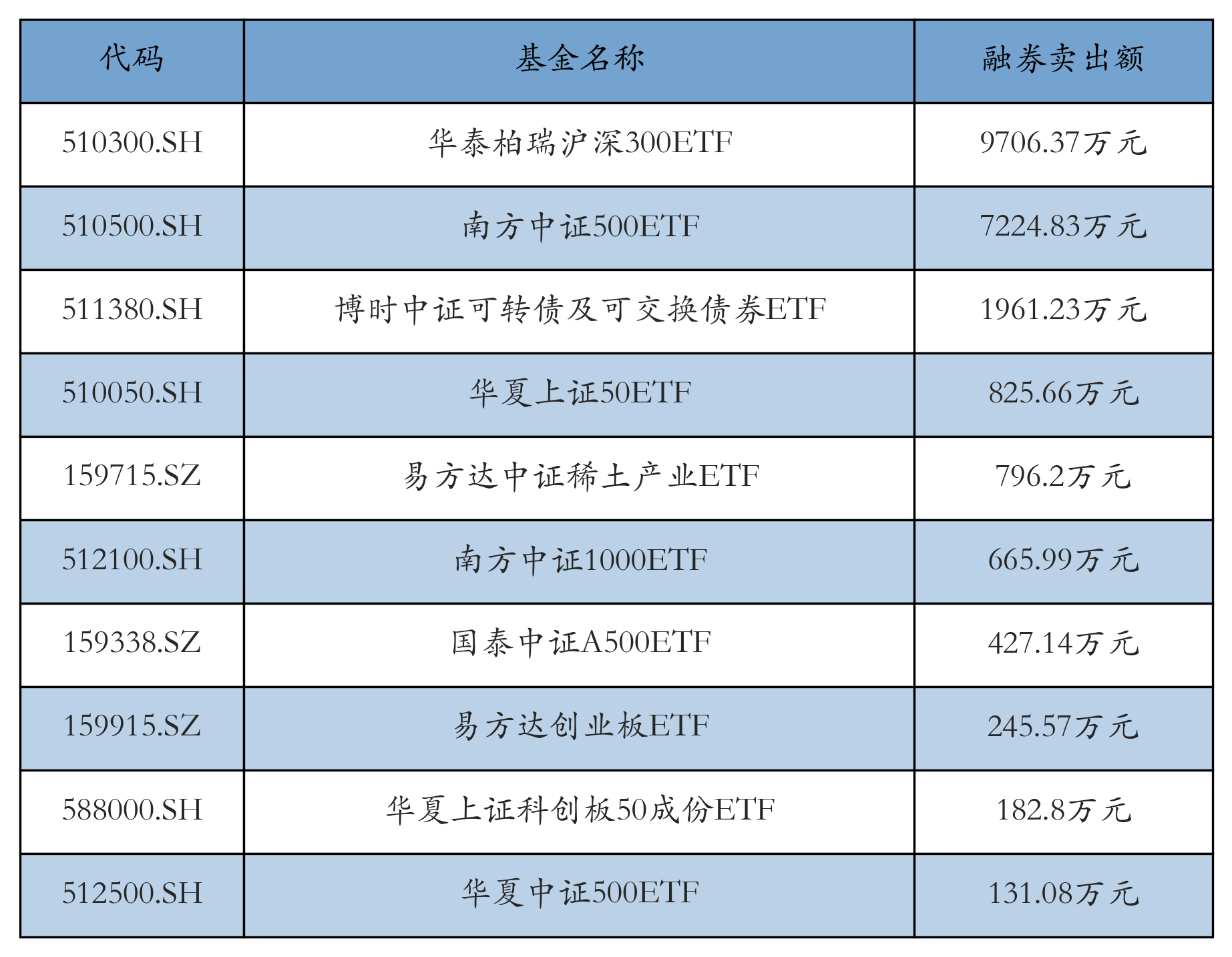 1月15日ETF融券賣出額前三位分別為:華泰柏瑞滬深300ETF(9706.37萬元)、南方中證500ETF(7224.83萬元)和博時(shí)中證可轉(zhuǎn)債及可交換債券ETF(1961.23萬元),前10具體見下表: