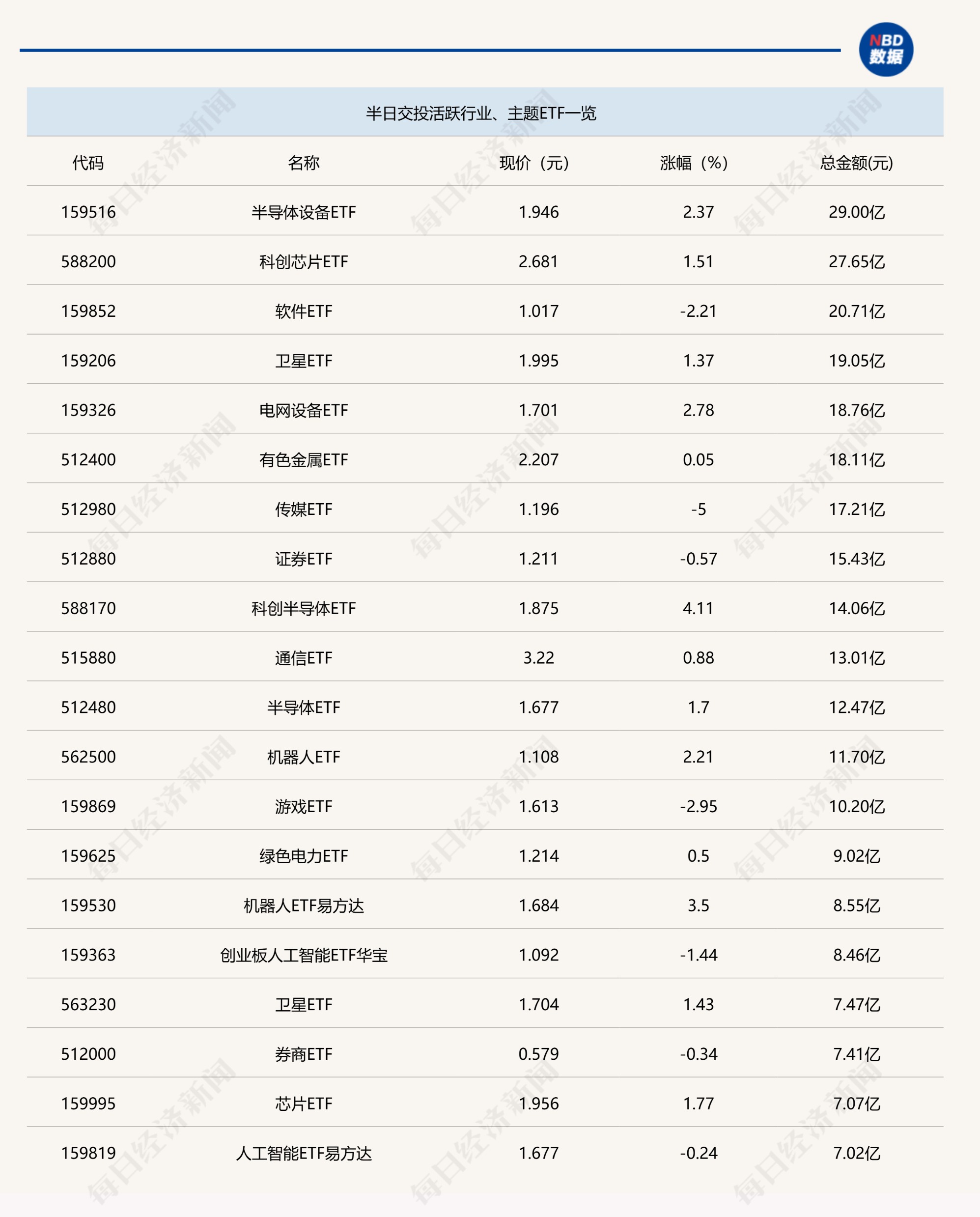 今日上午,半導(dǎo)體設(shè)備相關(guān)ETF交投活躍,其中,半導(dǎo)體設(shè)備ETF(159516)半日成交金額達(dá)到29億元,放量明顯;另外,科創(chuàng)半導(dǎo)體(588170)半日成交金額也接近15億元。跨境ETF方面,香港證券ETF易方達(dá)(513090)半日成交金額為43.13億元,量能呈現(xiàn)縮減態(tài)勢。