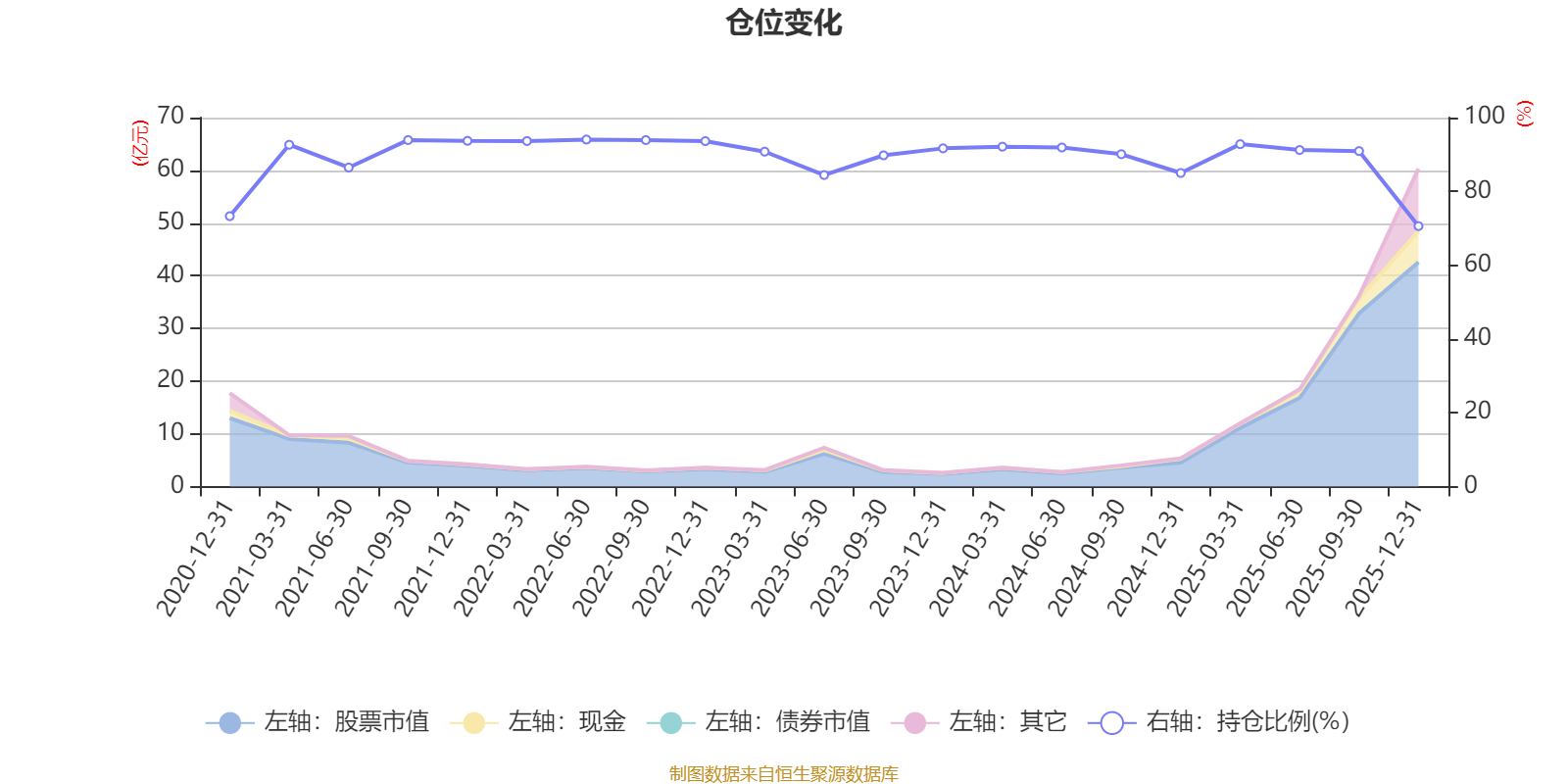 據(jù)定期報(bào)告數(shù)據(jù)統(tǒng)計(jì),近三年平均股票倉位為88.44%,同類平均為88.55%。2022年上半年末基金達(dá)到94.05%的最高倉位,2025年末最低,為70.59%。