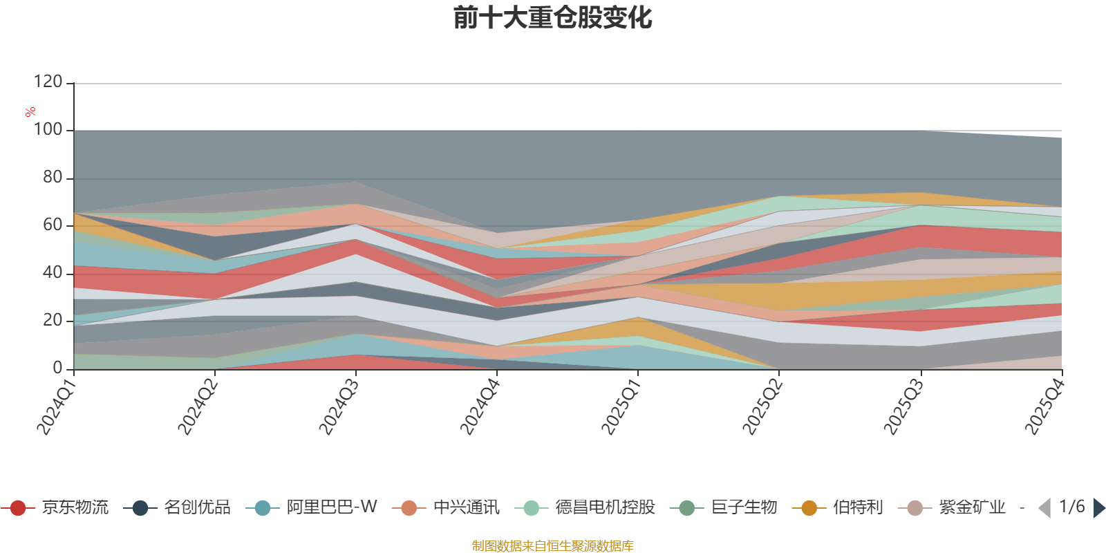 該基金持股集中度較高。截至2025年四季度末,基金十大重倉股分別是中際旭創(chuàng)、新易盛、源杰科技、騰訊控股、海博思創(chuàng)、劍橋科技、紫金礦業(yè)、勝宏科技、工業(yè)富聯(lián)、康方生物。
