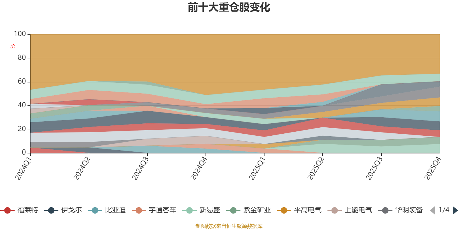 截至2025年四季度末,基金十大重倉股分別是思源電氣、中際旭創(chuàng)、陽光電源、新易盛、濤濤車業(yè)、寧德時代、紫金礦業(yè)、春風動力、海博思創(chuàng)、金盤科技。