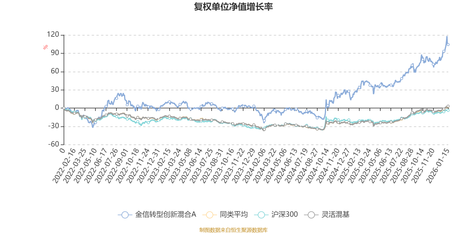 截至1月15日,金信轉(zhuǎn)型創(chuàng)新混合A近三個(gè)月復(fù)權(quán)單位凈值增長率為11.76%,位于同類可比基金289/1286;近半年復(fù)權(quán)單位凈值增長率為42.90%,位于同類可比基金243/1286;近一年復(fù)權(quán)單位凈值增長率為66.74%,位于同類可比基金158/1286;近三年復(fù)權(quán)單位凈值增長率為98.33%,位于同類可比基金35/1286。