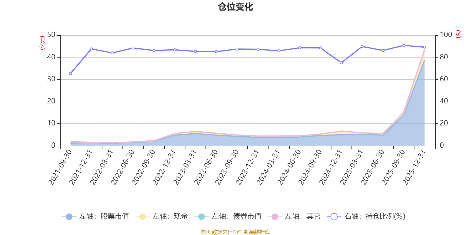 據(jù)定期報(bào)告數(shù)據(jù)統(tǒng)計(jì),近三年平均股票倉(cāng)位為86.66%,同類平均為87.74%。2025年三季度末基金達(dá)到90.81%的最高倉(cāng)位,2021年三季度末最低,為65.43%。