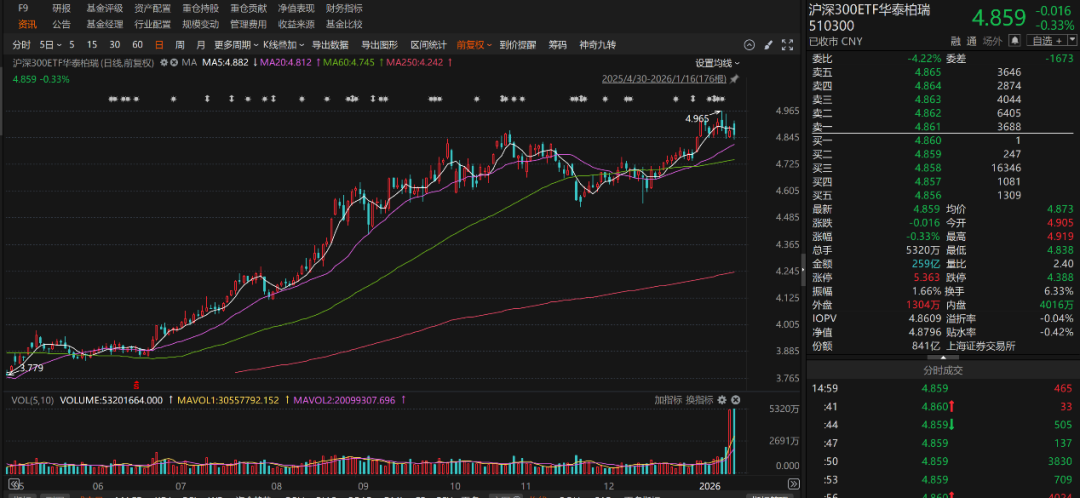全市場規(guī)模最大的華泰柏瑞滬深300ETF,1月16日的成交量同樣放大,繼1月15日成交254億元之后,1月16日成交量同樣突破200億元。