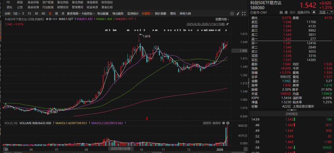 從易方達(dá)科創(chuàng)50ETF的走勢看,在下圖中的成交額柱狀圖中,可以看出,1月15日成交量開始放大,1月16日成交額則是顯著放大。