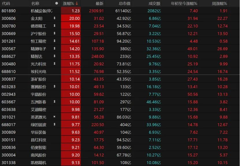 7只機(jī)械設(shè)備個(gè)股漲停,金太陽、德恩精工“20cm”漲停,滬寧股份、恒工精密、精測(cè)電子大漲,賽騰股份、宇晶股份、五洲新春、艾油精密等個(gè)股漲停。