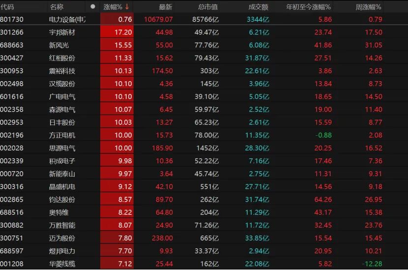 8只電力設(shè)備個(gè)股漲停,宇邦新材、新風(fēng)光、紅相股份大漲,漢纜股份、廣電電氣、森源電氣、日豐股份、方正電機(jī)、思源電氣等漲停。