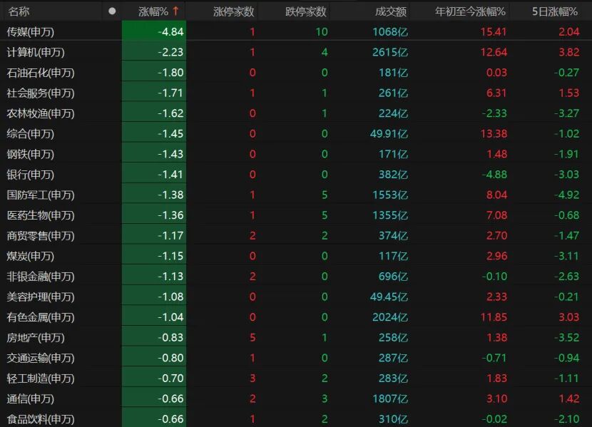 電子、汽車、機(jī)械設(shè)備、電力設(shè)備板塊領(lǐng)漲。但傳媒、計(jì)算機(jī)板塊回吐明顯,石油石化、社會(huì)服務(wù)、農(nóng)林牧漁、綜合、鋼鐵、銀行、國防軍工、醫(yī)藥生物、商貿(mào)零售等板塊跌幅均超過1%。