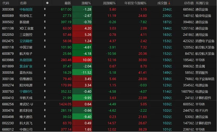市場(chǎng)共計(jì)2371只個(gè)股收漲,漲停股67只;2973只個(gè)股收跌,跌停股57只。日成交額超過100億元的共計(jì)20只,烽火通信、華勝天成、藍(lán)色光標(biāo)等熱門個(gè)股大跌,兆易創(chuàng)新漲停,三花智控、信維通信、陽光電源也表現(xiàn)不錯(cuò)。電子設(shè)備制造個(gè)股佰維存儲(chǔ)、江波龍大漲。