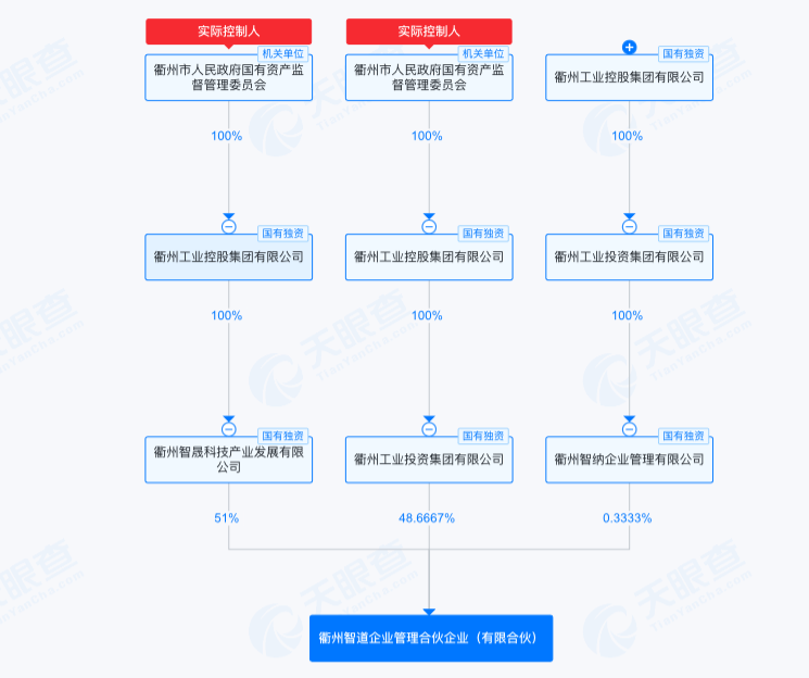 天眼查顯示,衢州智道企業(yè)管理合伙企業(yè)(有限合伙)由地方國資衢州工業(yè)控股集團有限公司(以下簡稱“衢州工控”)通過衢州智晟科技產(chǎn)業(yè)發(fā)展有限公司、衢州工業(yè)投資集團有限公司和衢州智納企業(yè)管理有限公司控股,背后實際控制人為衢州市國資委。