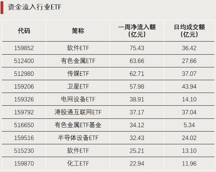 資金凈流入方面,1月12日至16日,凈流入額最多的10只ETF,多是行業(yè)ETF,包括軟件、有色金屬、傳媒、衛(wèi)星等行業(yè)的相關(guān)產(chǎn)品。其中,軟件ETF(159852)上周凈流入額達(dá)75.43億元,是上周凈流入額最多的ETF,有色金屬ETF和傳媒ETF上周凈流入額緊隨其后,均超過了60億元。