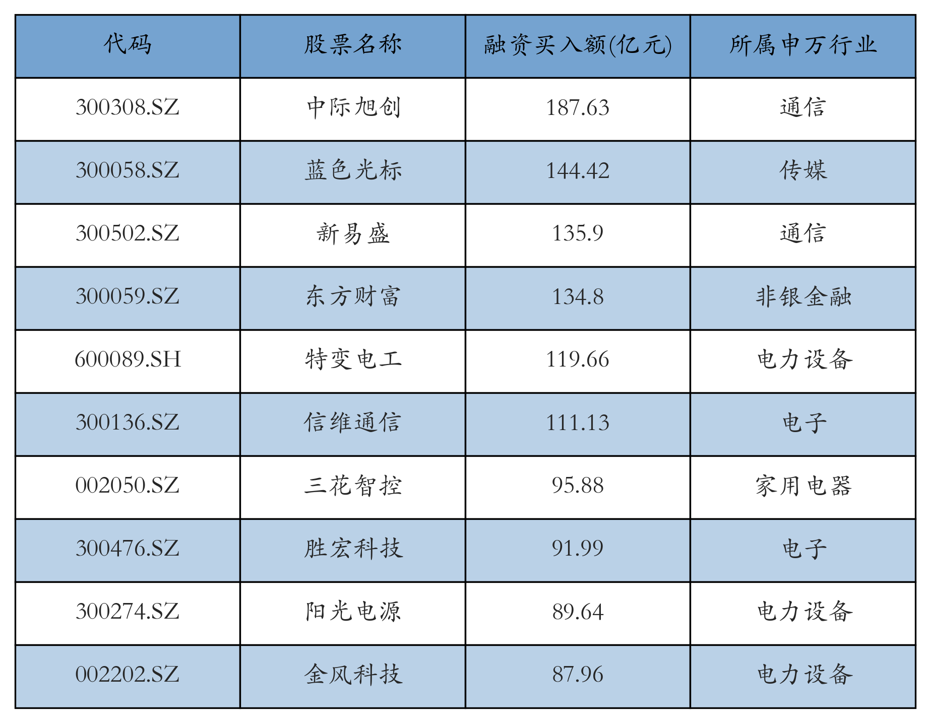 上周兩市共有3484只個股有融資資金買入,共有424只個股買入金額超10億元,其中中際旭創(chuàng)、藍色光標、新易盛排名前三,買入金額分別187.63億元、144.42億元、135.9億元。融資買入額前10個股詳情見下表: