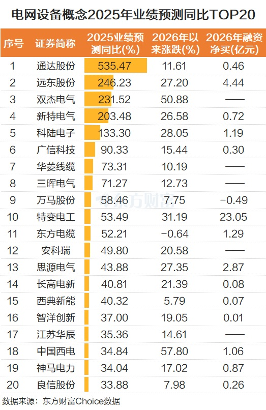 20家2025年業(yè)績預(yù)測同比靠前個股來看,2026年以來多數(shù)明顯上漲,雙杰電氣、中國西電漲超50%;特變電工漲超30%。