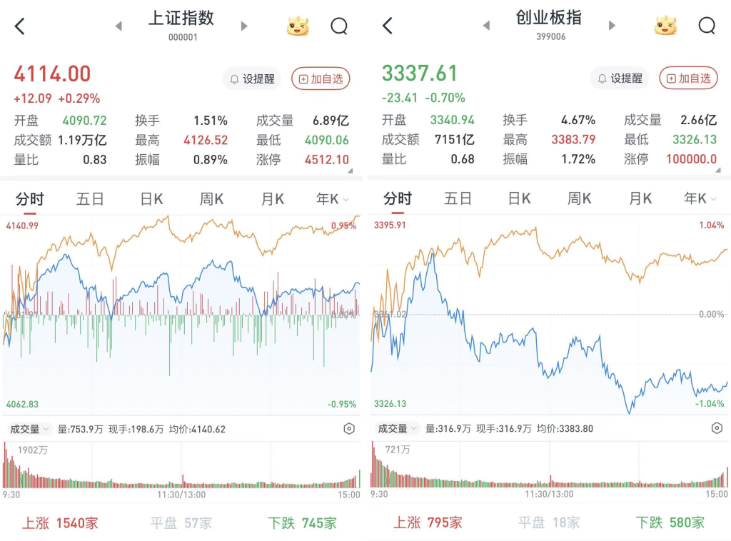 至收盤,上證綜指漲0.29%,報(bào)4114點(diǎn);科創(chuàng)50指數(shù)跌0.48%,報(bào)1506.86點(diǎn);深證成指漲0.09%,報(bào)14294.05點(diǎn);創(chuàng)業(yè)板指跌0.7%,報(bào)3337.61點(diǎn)。