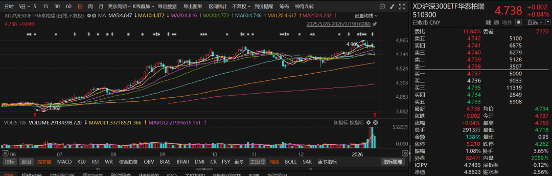 從華泰柏瑞滬深300ETF全天成交額來看,為138億元,較1月15日、16日有所減少,但依然處于近期的相對(duì)高位。