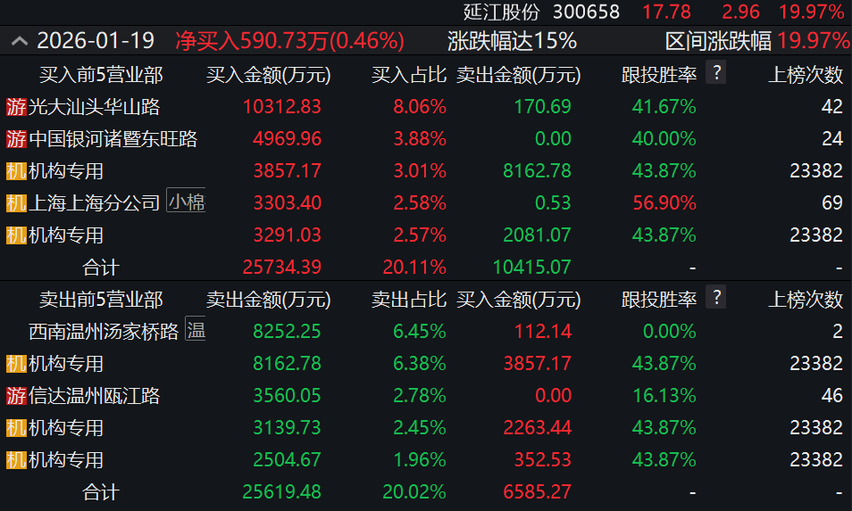 Wind龍虎榜數(shù)據(jù)顯示,上榜營業(yè)部席位全天成交5.63億元,其中,買入金額為2.85億元,賣出金額為2.79億元,合計(jì)凈買入590.73萬元。具體來看,機(jī)構(gòu)買入9764.17萬元,賣出1.59億元,合計(jì)凈賣出6124.08萬元;此外,光大證券汕頭華山路證券營業(yè)部、中國銀河證券諸暨東旺路證券營業(yè)部分別買入1.03億元、4969.96萬元;西南證券溫州湯家橋路證券營業(yè)部、信達(dá)證券溫州甌江路證券營業(yè)部分別賣出8252.25萬元、3560.05萬元。