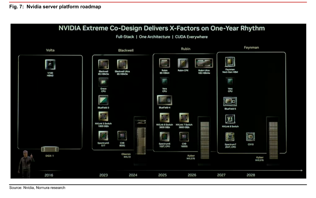 野村證券表示,英偉達繼續(xù)引領(lǐng)AI網(wǎng)絡(luò)技術(shù)演進。其Rubin系列平臺將采用NVLink 6.0技術(shù)(3600GB/s),配備CX9網(wǎng)卡(1.6Tbps)和Spectrum 6 CPO交換機(102T)。在scale-up網(wǎng)絡(luò)中,Rubin Ultra NVL576將使用正交背板(PCB)替代銅纜背板;在scale-out網(wǎng)絡(luò)中,將部署1.6T IB/以太網(wǎng)交換機。該公司還在2026年3月的GTC活動中可能披露更多Spectrum-X以太網(wǎng)版本CPO產(chǎn)品細節(jié)。