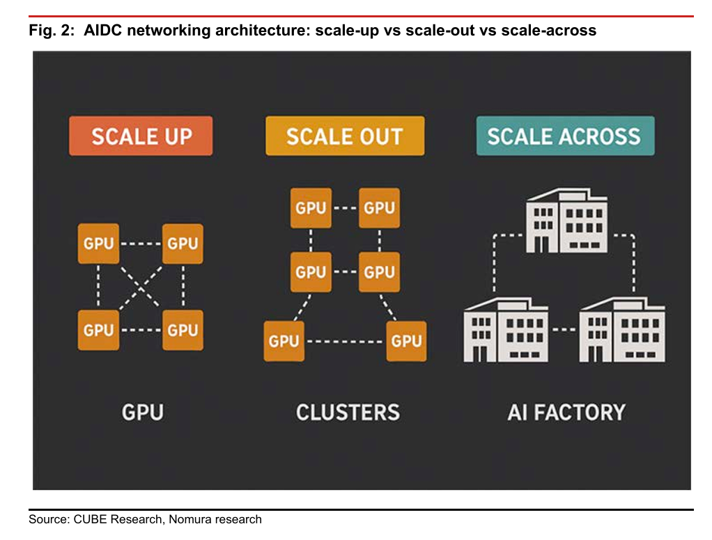 野村證券表示,AI數(shù)據(jù)中心需要在不同層級擴展算力和互聯(lián)能力,形成了三個關(guān)鍵層級:scale-up(機架內(nèi)互聯(lián))、scale-out(機架間/集群互聯(lián))和scale-across(跨數(shù)據(jù)中心互聯(lián))。