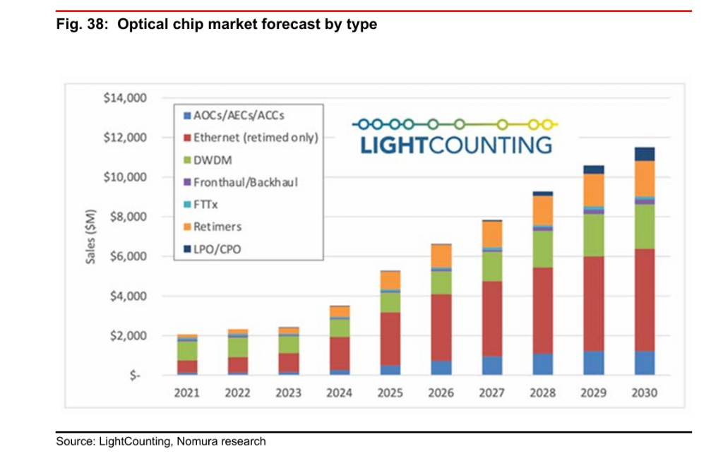 CPO技術(shù)正處于商業(yè)化前夜。野村預(yù)計,CPO交換機滲透率(按出貨量計)將從2026年的3%提升至2030年的20%,市場規(guī)模將從2026年的16億美元增至2030年的131億美元。