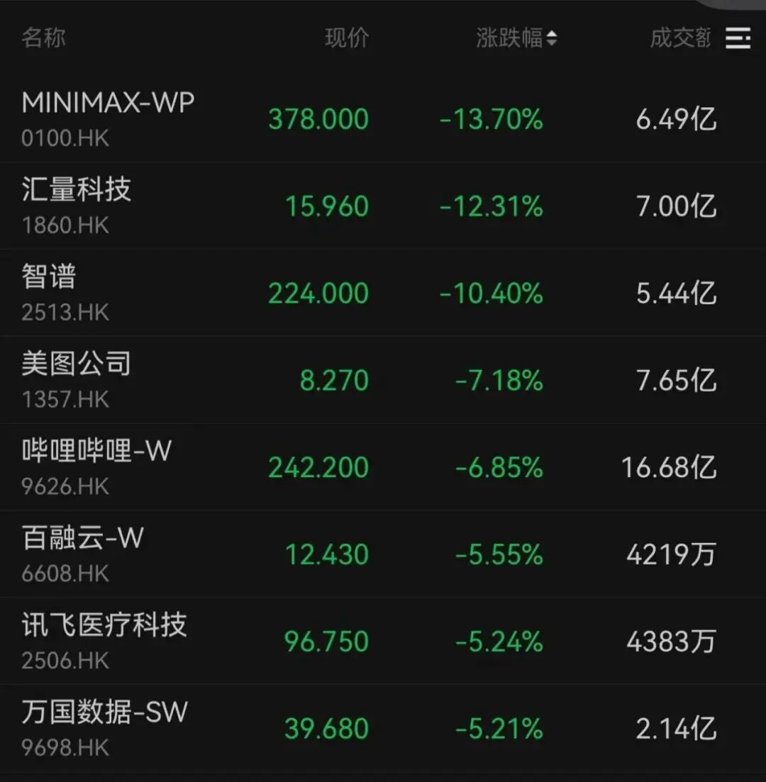 港股市場今日調整,金融和科技股拖累大市。AI應用延續(xù)跌勢,新股智譜、MINIMAX-WP跌幅較大。
