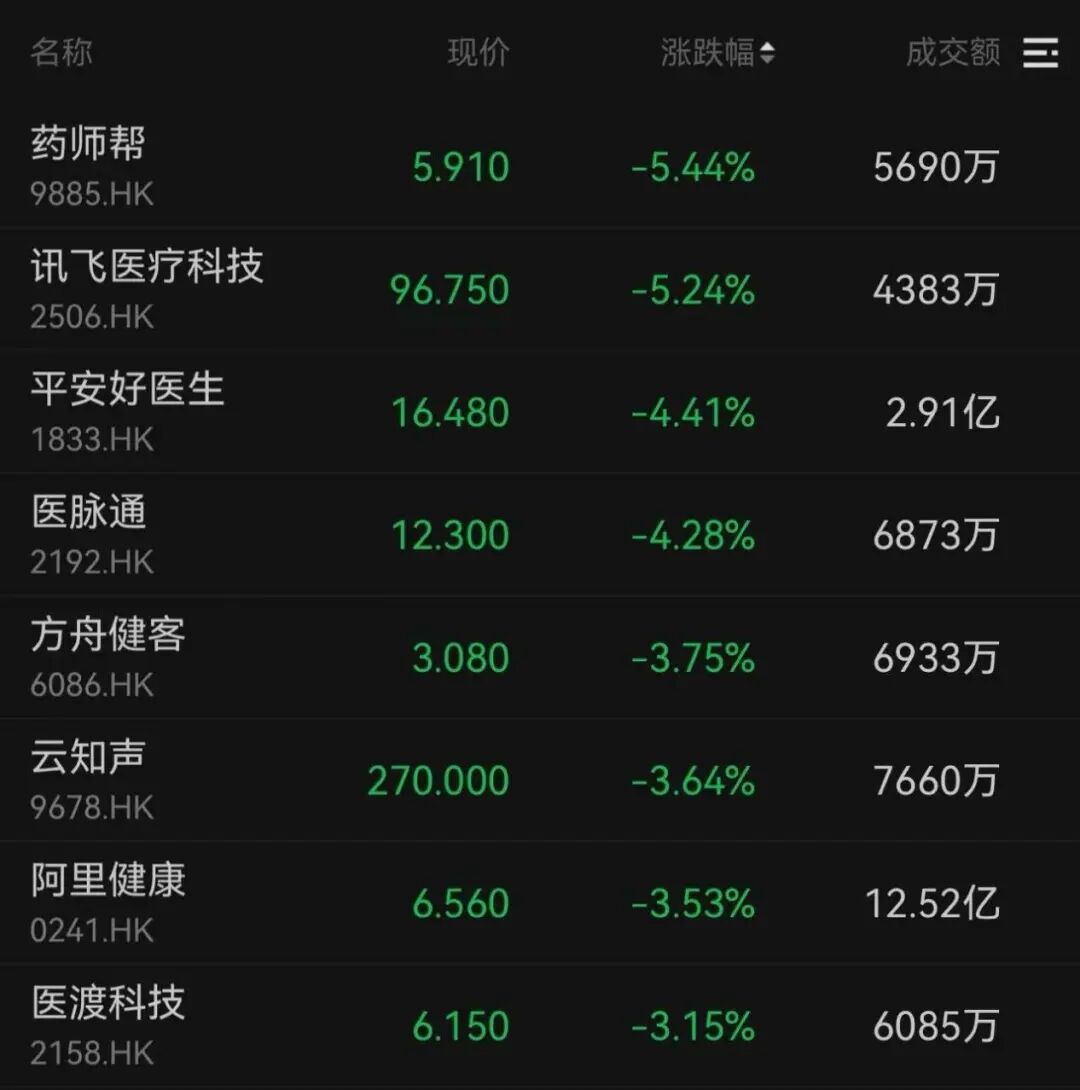 互聯(lián)網醫(yī)療與AI應用股今日同步走低。藥師幫、平安好醫(yī)生、阿里健康分別下跌5.44%、4.41%、3.53%;MINIMAX-WP、匯量科技、智譜均跌超10%。