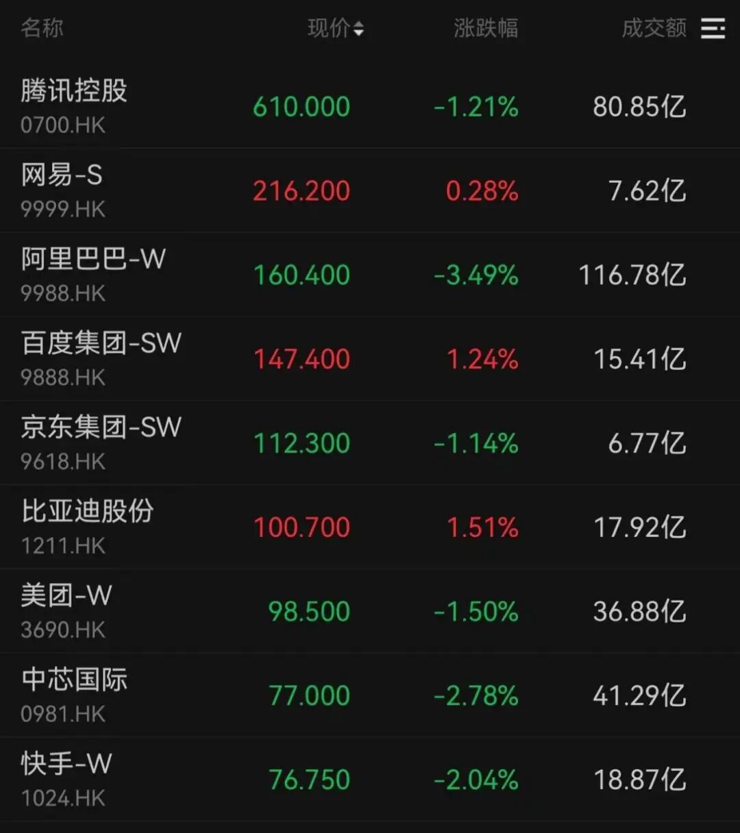 阿里巴巴下跌3.49%,成交額約117億港元。美團-W、京東集團-SW、騰訊控股均跌超1%。