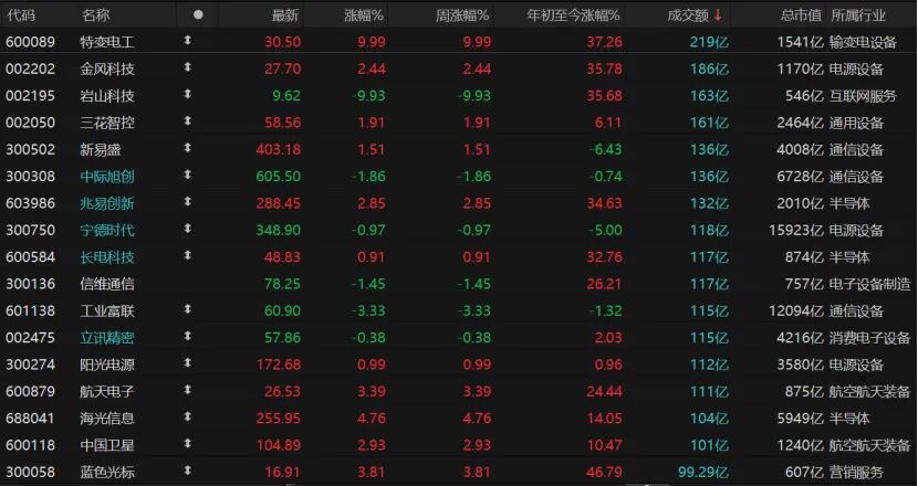 個股漲多跌少,共計3527只個股收紅,漲停股103只;1828只個股收跌,跌停股30只。今日僅有16只個股日成交額超過100億元,特變電工等多只輸變電設(shè)備個股漲停,金風科技跌停后翻紅2.44%報27.7元/股,中國衛(wèi)星、航天電子等航空航天裝備個股收紅。