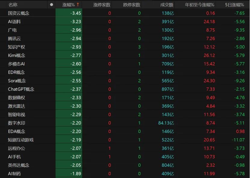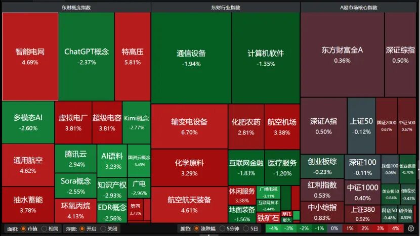 盤面上,智能電網(wǎng)、特高壓、輸變電設(shè)備、航空航天裝備、第四代半導體大漲,但通信設(shè)備、計算機軟件、AI語料下跌。