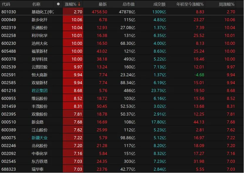 10只化工股漲停,新鄉(xiāng)化纖、樂通股份、利爾化學、滄州大化、福來新材等漲停。