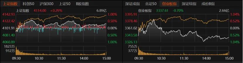 今日指數(shù)漲跌溫和,滬指微漲0.29%報4114點,創(chuàng)業(yè)板指收跌0.7%報3337.61點,深證成指、滬深300、北證50微紅,科創(chuàng)50、上證50微跌。