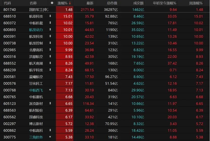7只國防軍工個股漲停,中航機載、航發(fā)動力、航發(fā)科技、航發(fā)控制、北摩高科漲停。