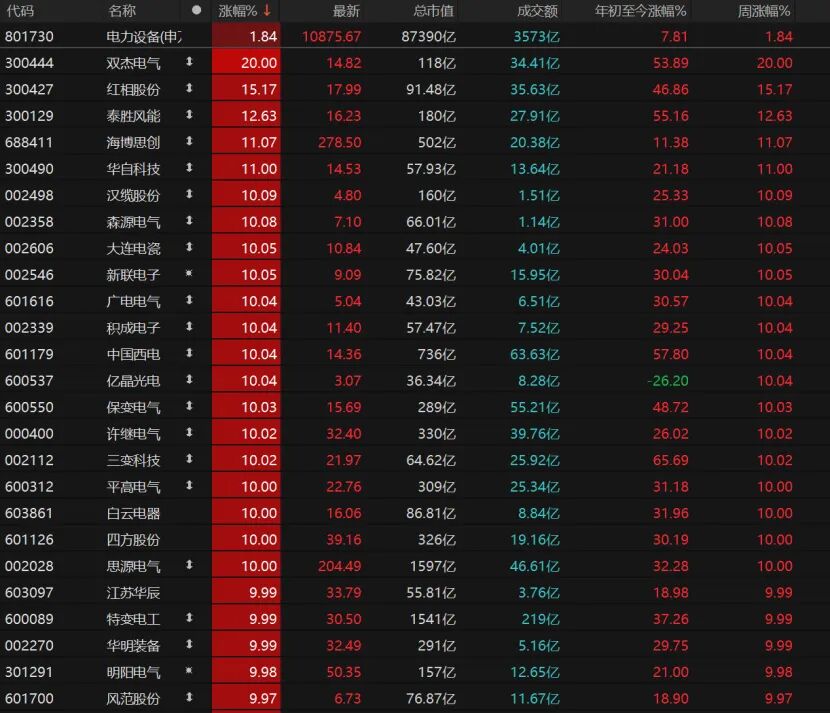 23只電力設(shè)備個股漲停,雙杰電氣“20cm”漲停,紅相股份、泰勝風能、海博思創(chuàng)、華自科技漲幅均超過10%,漢纜股份、森源電氣、大連電瓷、新聯(lián)電子、廣電電氣、積成電子、中國西電均漲停。
