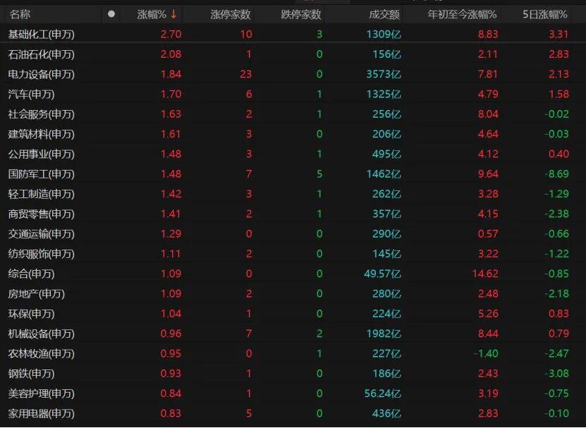 31個申萬一級行業(yè)中,計算機、通信等板塊領(lǐng)跌,銀行、醫(yī)藥生物、電子、傳媒、非銀金融微跌?;?、石油、汽車、電力設(shè)備、軍工等板塊領(lǐng)漲。整體而言,板塊漲跌溫和。