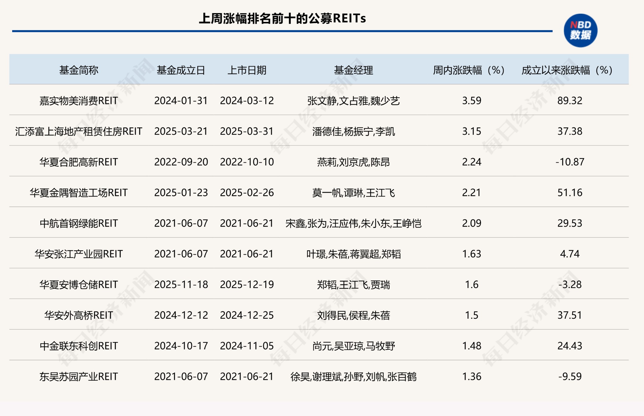 單只產品方面,已上市的78只公募REITs產品中,環(huán)比上漲的減少至29只。漲幅最大的三只產品依次為嘉實物美消費REIT、匯添富上海地產租賃住房REIT和華夏合肥高新REIT,周內分別上漲3.59%、3.15%和2.24%。
