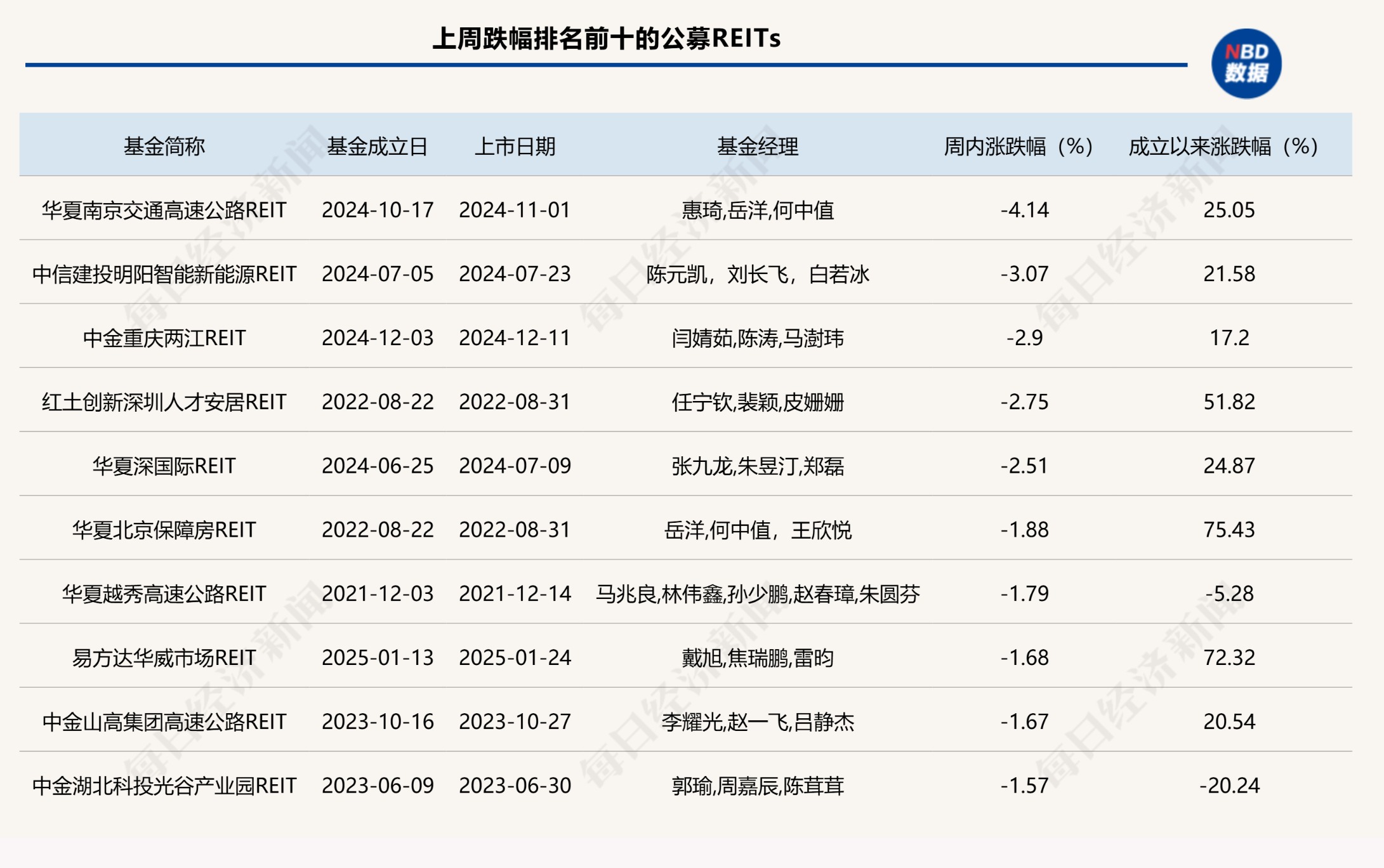環(huán)比下跌的產品則增加至49只,跌幅最大的三只產品為華夏南京交通高速公路REIT、中信建投明陽智能新能源REIT和中金重慶兩江REIT,上周分別下跌了4.14%、3.07%和2.9%。