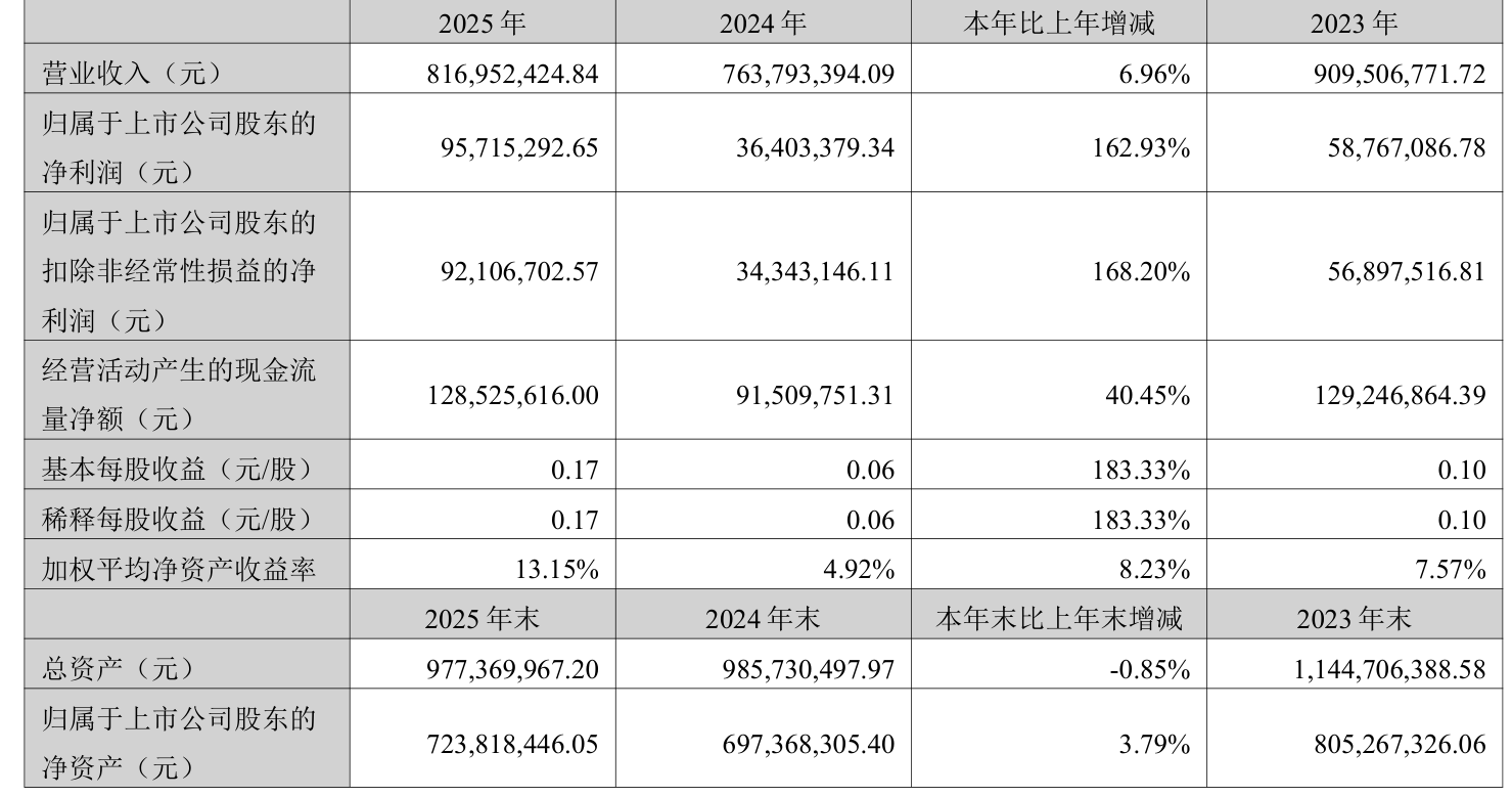 中證智能財(cái)訊沃華醫(yī)藥(002107)1月20日披露2025年年度報(bào)告。2025年,公司實(shí)現(xiàn)營(yíng)業(yè)總收入8.17億元,同比增長(zhǎng)6.96%;歸母凈利潤(rùn)9571.53萬元,同比增長(zhǎng)162.93%;扣非凈利潤(rùn)9210.67萬元,同比增長(zhǎng)168.20%;經(jīng)營(yíng)活動(dòng)產(chǎn)生的現(xiàn)金流量?jī)纛~為1.29億元,同比增長(zhǎng)40.45%;報(bào)告期內(nèi),沃華醫(yī)藥基本每股收益為0.17元,加權(quán)平均凈資產(chǎn)收益率為13.15%。公司2025年度分配預(yù)案為:擬向全體股東每10股派現(xiàn)1.46元(含稅)。