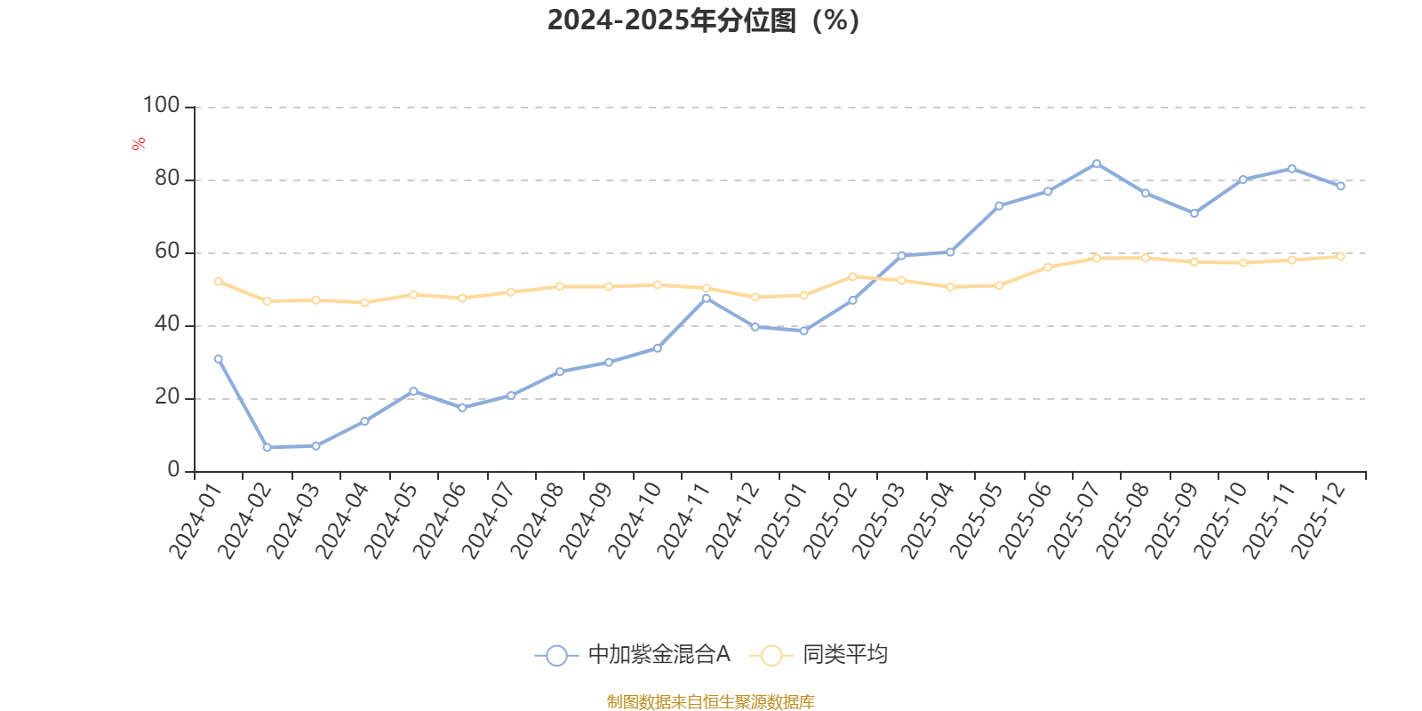 通過所選區(qū)間該基金凈值增長(zhǎng)率分位圖,可以觀察該基金與同類基金業(yè)績(jī)比較情況。圖為坐標(biāo)原點(diǎn)到區(qū)間內(nèi)某時(shí)點(diǎn)的凈值增長(zhǎng)率在同類基金中的分位數(shù)。