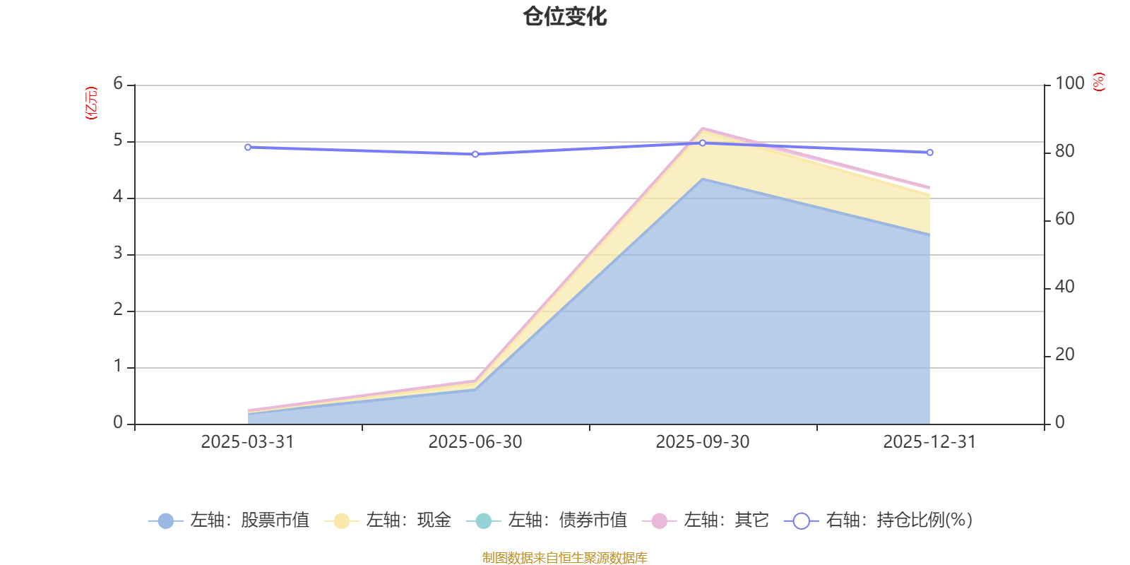 據(jù)定期報(bào)告數(shù)據(jù)統(tǒng)計(jì),成立以來平均股票倉(cāng)位為80.98%,同類平均為87.13%。2025年三季度末基金達(dá)到82.83%的最高倉(cāng)位,2025年上半年末最低,為79.5%。