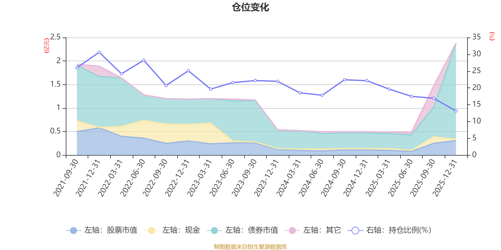 據(jù)定期報(bào)告數(shù)據(jù)統(tǒng)計(jì),近三年平均股票倉位為19.46%,同類平均為19.14%。2021年末基金達(dá)到30.62%的最高倉位,2025年末最低,為13.15%。
