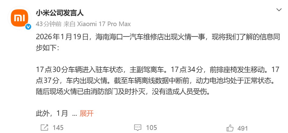 1月20日,小米公司發(fā)言人在微博發(fā)表聲明,就1月19日發(fā)生的兩起相關(guān)事件作出回應(yīng)。這兩起事件分別為海南??谝黄嚲S修店車輛火情和河南蘭南高速小米YU7交通事故。