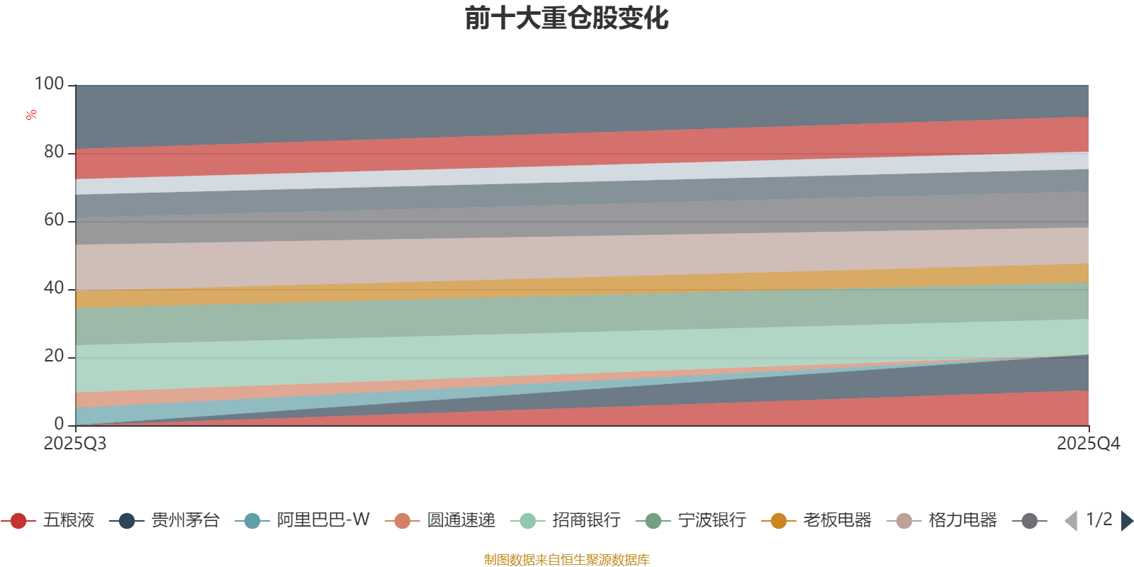 該基金持股集中度較高。截至2025年四季度末,基金十大重倉股分別是寧波銀行、格力電器、中國平安、貴州茅臺、招商銀行、五糧液、美的集團(tuán)、中國國航、老板電器、常熟銀行。