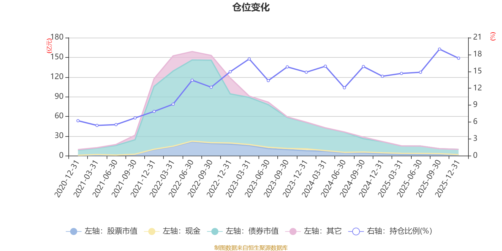 據(jù)定期報告數(shù)據(jù)統(tǒng)計,近三年平均股票倉位為15.42%,同類平均為19.13%。2025年三季度末基金達(dá)到18.96%的最高倉位,2021年一季度末最低,為5.4%。